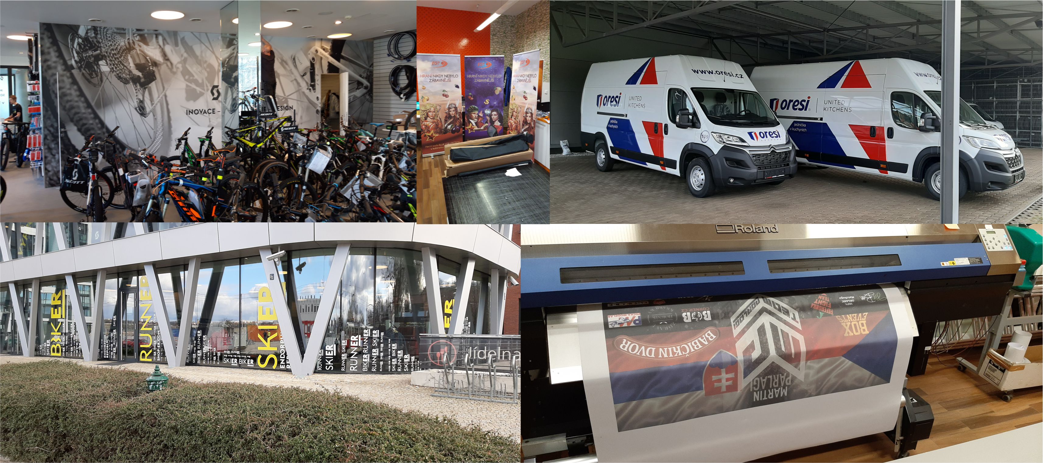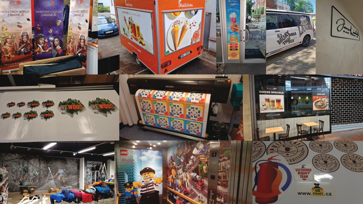 |   Velkoformátový tiskVelkoformátový tisk na stroji Mutoh XpertJet 1341SR Pro. Tisková šíře 137 cm, délka tisku není omezena. Tiskneme na samolepící folie, papíry, bannery, plátna a další média. Dokončovací práce : ořez na formát, ořez do libovolného tvaru u samolepících folií, laminování. |   Polepy autRealizujeme polepy aut od výroby, až po instalaci. Polepy vyrobíme podle dodaného návrhu, nebo s návrhem rádi pomůžeme. Realizujeme i polepy oken, certifikovanou okenní folií. Na auta vyrábíme i magnetické folie. |   Exteriéry a interiéryVyrábíme a instalujeme polepy exteriérů a interiérů, prodejen, provozoven služeb, ale i bytových dekorací. Vyrábíme jak klasické reklamní polepy, tak i speciální folie / dekorační, bezpečnostní, protisluneční apod. / |   SamolepkySamolepky vyrábíme kombinací tisku a následného ořezu, nebo přímo řežeme z barevných plotrových folií. |   Další produktyBannery, plakáty roll-up systémy, řezaná grafika, speciální folie, magnetické folie, polepy výloh, deskových materiálů a mnoho dalšího... |